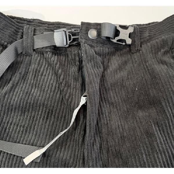 柔らかなコーデュロイ生地を使ったカーゴパンツ。ウエストにはバックル付きのテープベルト内蔵ですが、ベルトループも付いています。フロントはフライファスナー仕様。タックボタンもロゴ入りのオリジナルデザインです。フロント左右の腰ポケットは、マグネットボタン付きフラップポケットとスラッシュポケットの二重構造。膝上の大きなマグネットボタン付きフラップポケットには、ロゴ刺繍とピスネーム、さらに軍パンの名ごりとして戦闘時や負傷時に使用できるテープ状のエマージェンシーコードも搭載